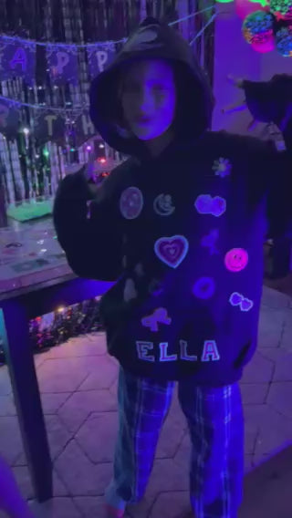 Guests typically spend about 40 minutes designing their sweatshirt, choosing graphics and patches while chatting and hanging out. Pressing happens after designs are finalized and should be handled by an adult or capable teen using a craft heat press. Plan on 45 minutes to an hour of pressing time for 6 sweatshirts. For this reason, start the party with the activity so the person pressing the sweatshirts can continue to press while everyone else enjoys other party activities.